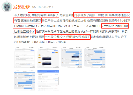 有消费者向黑猫平台反馈称:自己在代练通平台找代打时明确写明了代打要求,代打不按约定打单、毁单,玩家联系平台客服申请仲裁失败,接单前承诺的违约扣除保证金不执行,号主质疑平台仲裁结果的公正性。截至目前,代练通官微累计投诉2270余单,暂无任何回复。
